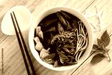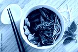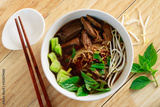 Braised chicken noodle soup. Thai food style. Close up. Top view.