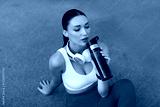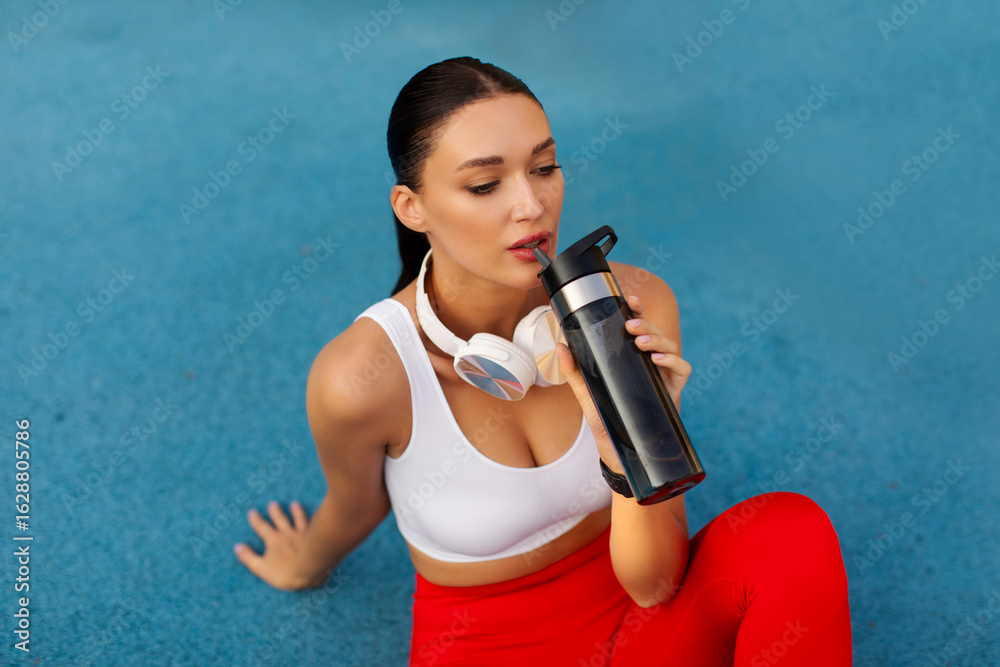 Energy, vitality concept. Fit woman sitting on basketball field ground, holding bottle, drinking water while taking break after outdoors workout, above view shot