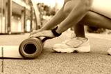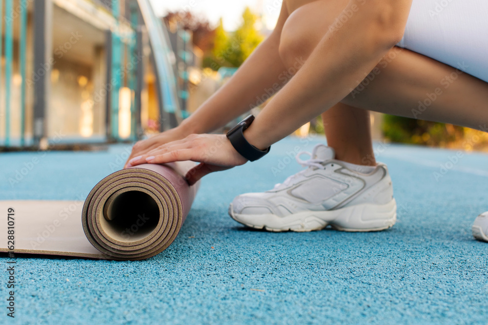 Unrecognizable sportswoman dressed in sportswear and sneakers rolling mat after outdoors class exercises during daytime. Morning workout training