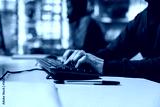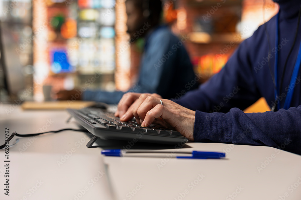 Call center agent typing on keyboard, using remote access tools to connect to customer devices remotely for troubleshooting. Customer center employee using PC to assist users with installing software