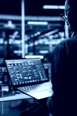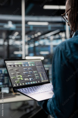 Close up of data center admin using laptop to setup machine learning systems handling information. IT specialist using notebook device to train neural networks to improve server farm operations