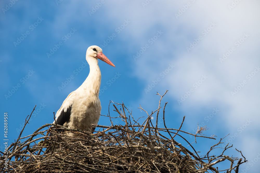 Weißstorch Ciconia ciconia im Storchennest auf einem Lichtmast