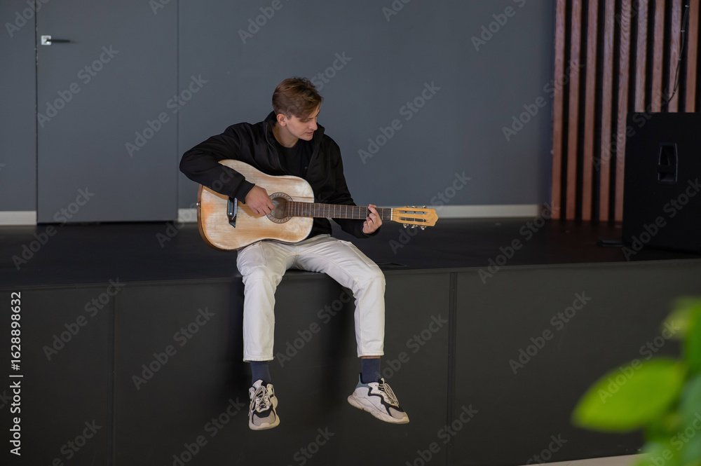 Caucasian man playing guitar while sitting on stage.