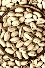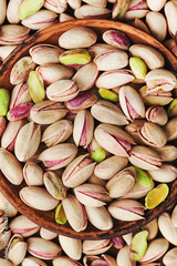 Bowl of pistachio nuts on wooden table from above. Healthy food and snack.