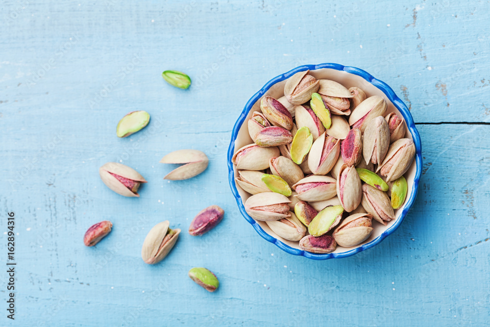 Bowl of pistachio nuts on blue rustic table top view. Healthy food and snack.