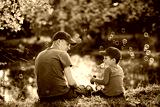 Father and son on the shore of the lake