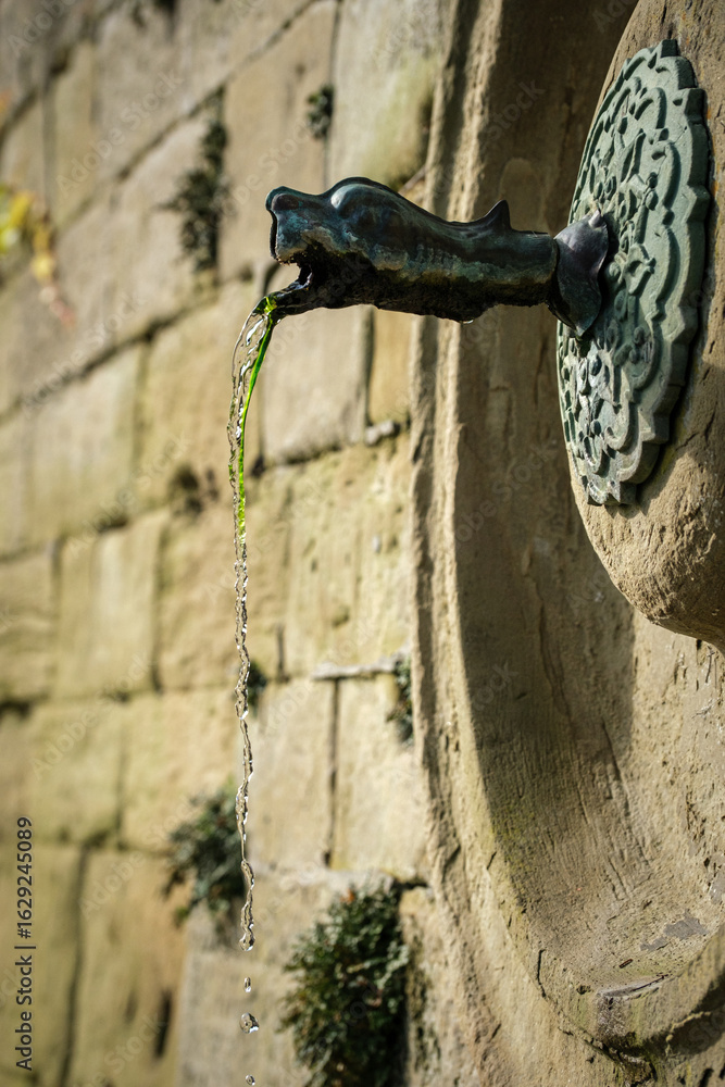 Historic ancient copper water dispenser with green copper shavings
