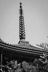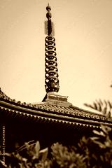 Vertical image of the red ancient building exterior and roof of the pagoda at the Kiyomizudera temple outdoor at daytime during summer in Kyoto city in Japan.