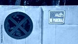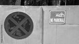 Weathered signs, including a 'No Parking' sign and a no-stopping sign, are attached to a gray fence with visible signs of wear and tear