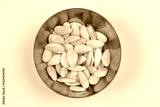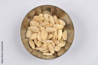 A stainless steel bowl filled with blanched almonds, set against a simple, solid gray background
