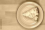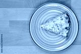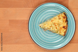 A delicious slice of zucchini and leek quiche rests on a blue ceramic plate, placed on a light-colored wooden table with ample copy space