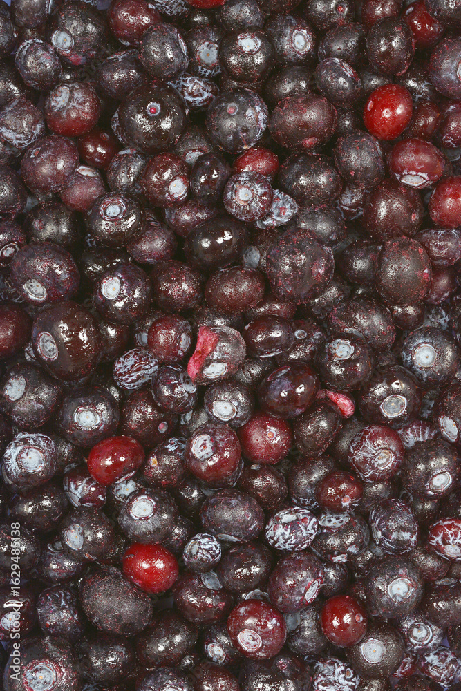 A close-up, top-down view of a large pile of freshly thawed blueberries, showing their texture and natural color variations