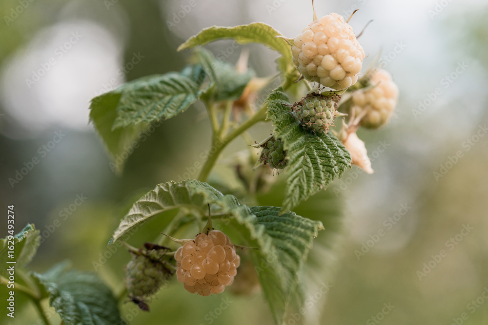 Golden Raspberry Development on Branch, Unripe Fruit Closeup, Green Leaves, Natural Light, Agricultural, Garden, Summer, Selective Focus, Texture.