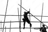 People work on a bamboo scaffold in Hong Kong. People with unrecognizable faces.