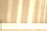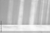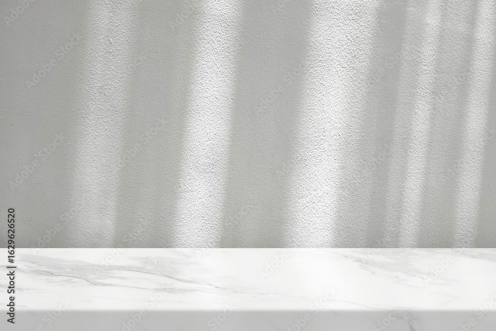 White marble table with a white stucco wall texture background featuring natural light beams and shadows