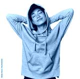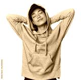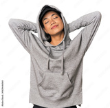 Young Filipino woman in studio feeling confident, with hands behind the head.