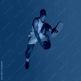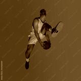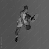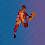 Basketball player mid-air against gradient background in action. Concept of cinematic jump, neon dynamics, athlete elevation, and campaign visuals for modern sportswear.