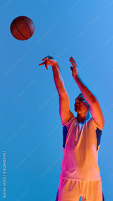 Basketball athlete launching ball with vibrant lighting and blue backdrop. Concept of precision shooting, technical mastery, sports discipline, and vertical action for editorial use.