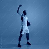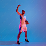 Energetic basketball player celebrates with ball under vibrant lighting. Concept of after-play ritual, calm strength, motivational expression, and sports ambassador portrayal