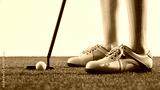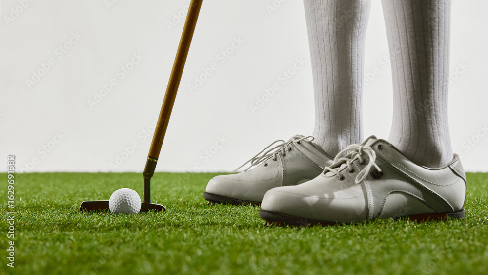 Close-up of golf shoes and putter on green grass. Concept of fashion and sportswear, wellness habits, and editorial publishing focused on female-focused active lifestyle.