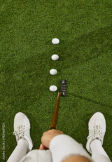 Top view of golfer feet and putter with three balls aligned on green turf. Concept of golf technique, athlete focus, fitness content, and balance-themed campaigns.