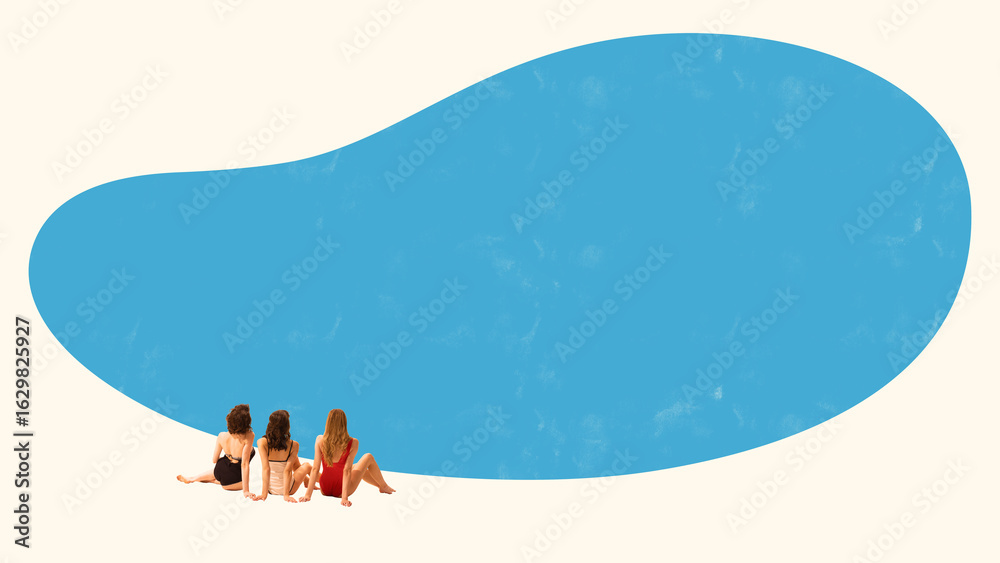 Graphic composition of three women sitting by blue abstract water shape with soft copy space. Concept of friendship, summer pause, feminine connection, and dreamy escapism.
