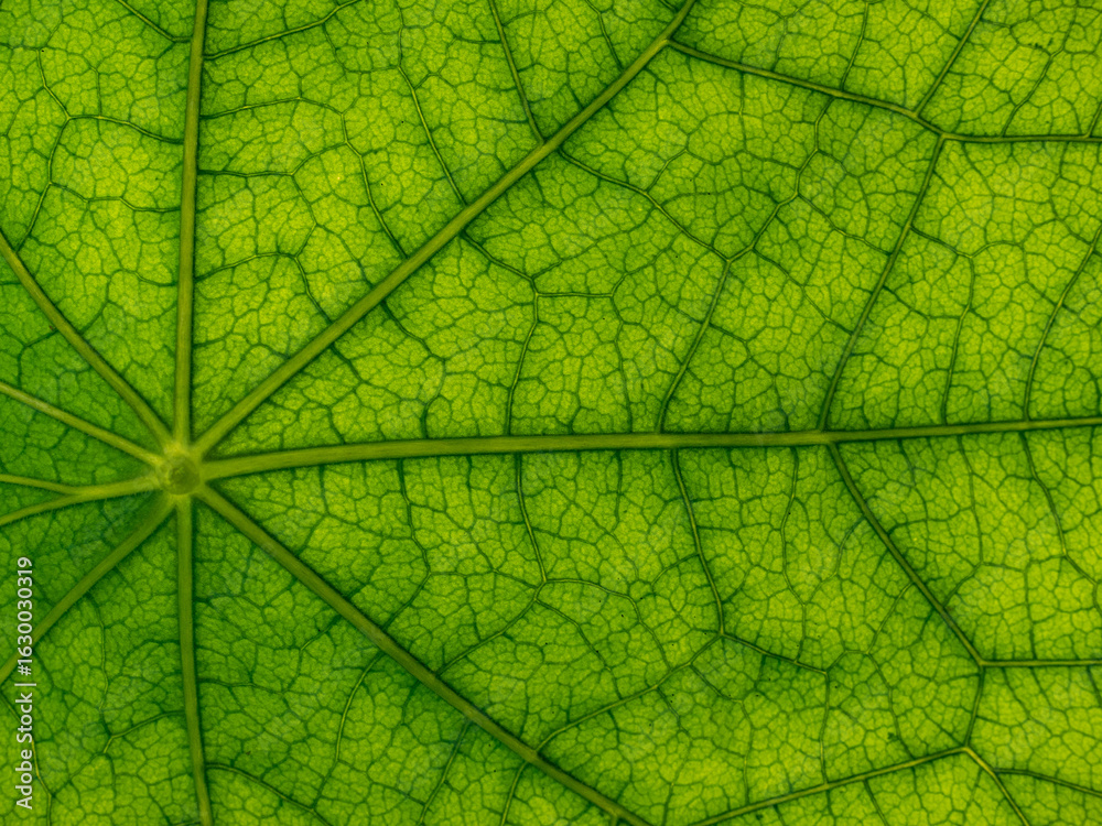 Close-up of green leaves with backlight showing fine veins and shadow play. Natural botanical texture, ideal for backgrounds and prints. Real photo, no AI.