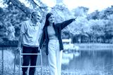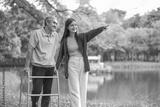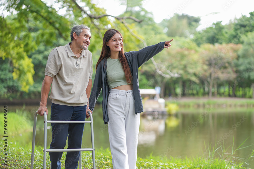 elderly man using walker aid rehabilitation in the park with a young adult daughter take care and support