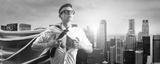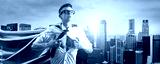Business superhero. Young businessman showing super hero suit under his shirt down town on sunset.