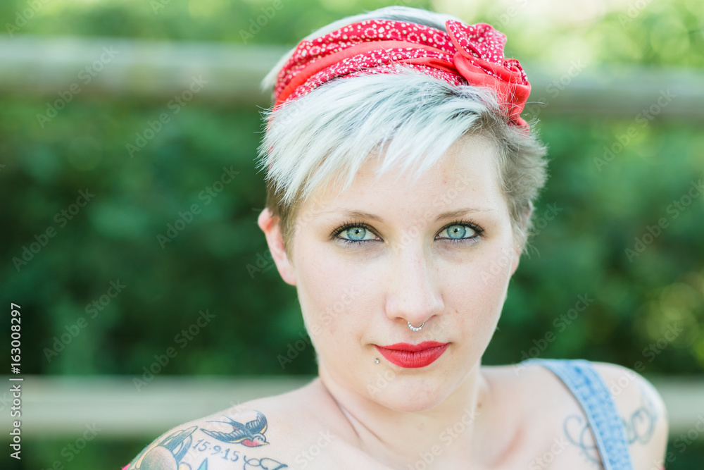 Young blonde pinup girl with a red bow in her hair posing in the garden. Concept pinup woman.
