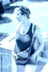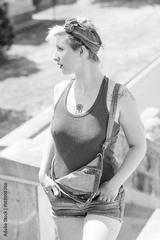 Young blonde pinup girl with a red bow in her hair going up the stairs. Concept pinup woman.