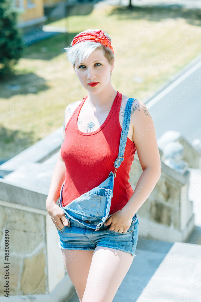Young blonde pinup girl with a red bow in her hair going up the stairs. Concept pinup woman.