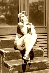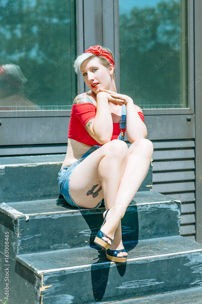 Young blonde pinup girl with a red bow in her hair sitting on the old wood stairs. Concept pinup woman.