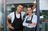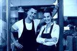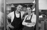 Young man and woman working at cafe
