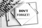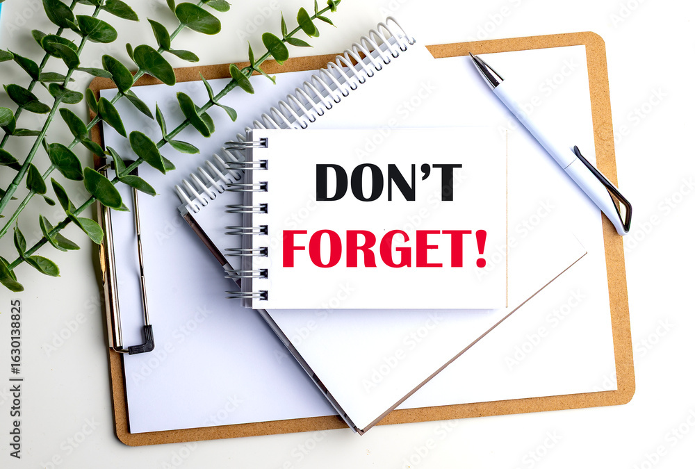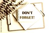 Don't forget reminder text on spiral notepad with clipboard, pen, and green leaves on white background