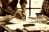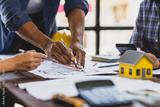 Architects and engineers are pointing at building plans and discussing over a model house, collaborating on a construction project.