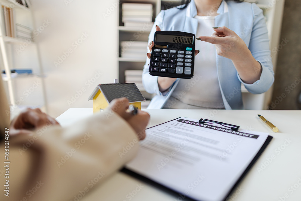 Real estate agent holding a calculator is bidding on a house for a female client. Businesswoman, real estate agents discuss offer house sale prices, fee, mortgage, interest, rent, cash flow, loan.