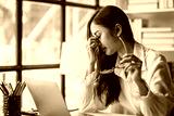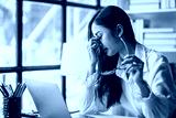 A woman in the office is stressed and has a headache from overwork. Myopic woman who wears glasses feels tired.