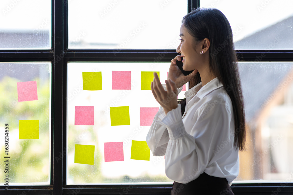 Attractive young Asian businesswoman in office standing using mobile phone to send message and talking to someone on the phone.