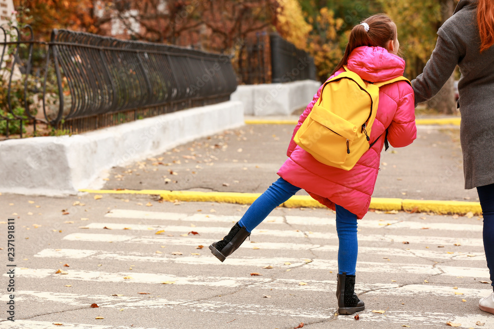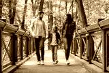 Young smiling interracial family holding hands and walking through the wooden bridge in forest