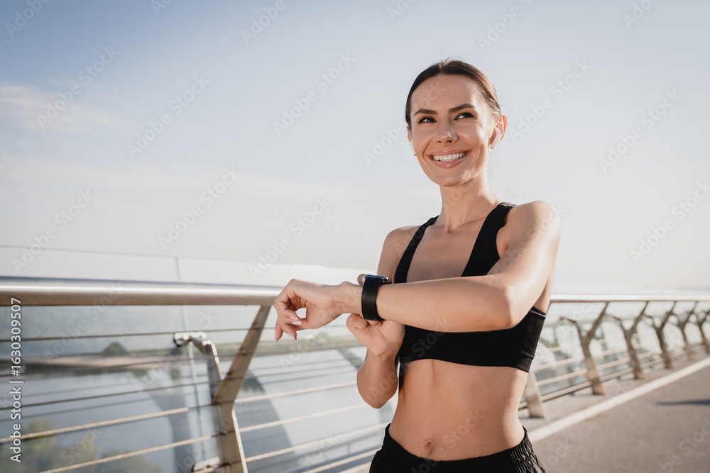 Uses a smart watch to measure the pulse on the hands. A woman does sports on the street. Fitness and a healthy lifestyle. The trainer does exercises for stretching the body.