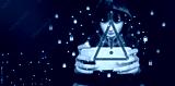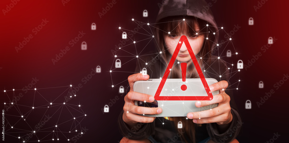 A teenage girl in a hoodie sits with a tablet. Warning sign. Virus, malware, personal information hacking. Internet access restriction for children. Parental control, cybersecurity.