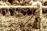 Woman in the garden, farming potatoes in organic farm, work on field or summer gardening
