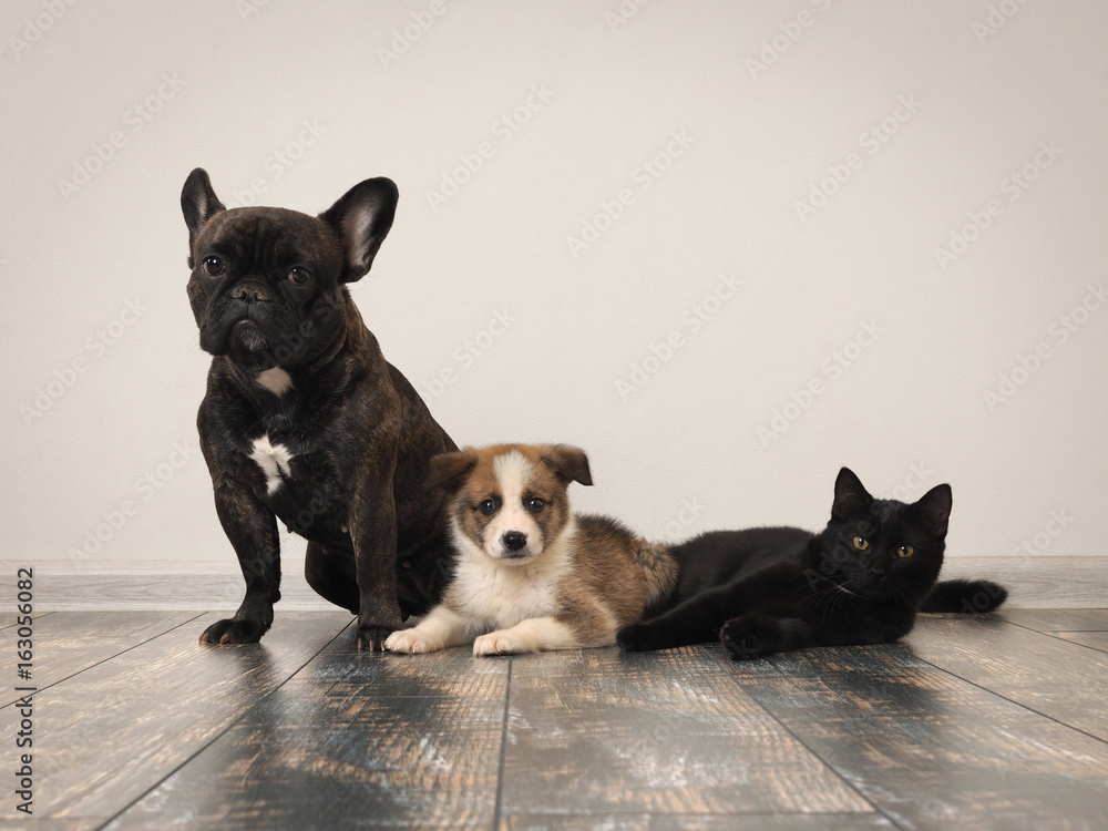 Adult dog, puppy and cat on the floor