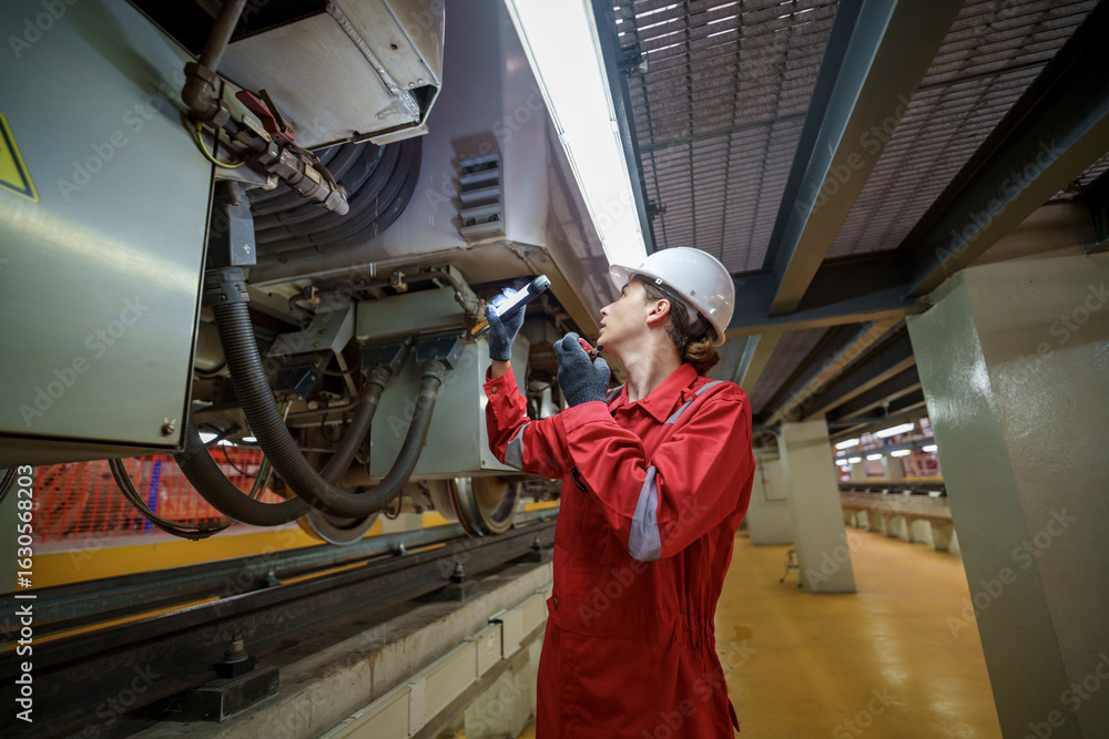 Technician inspecting train components in underground facility during daytime