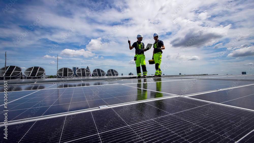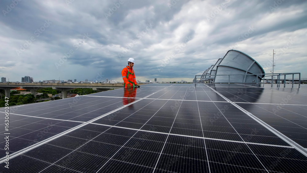 Technician inspects solar panels on a rooftop under cloudy skies in an urban area
