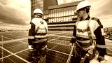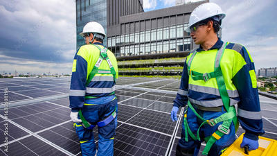 Workers install solar panels on a rooftop in a modern city setting during the afternoon