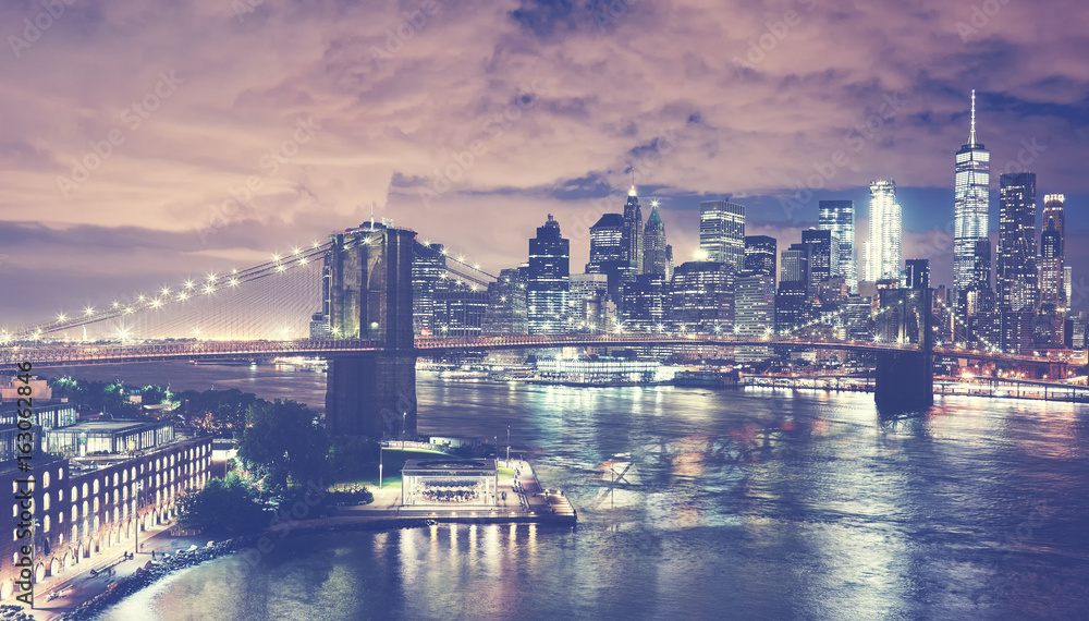 Vintage toned picture of New York City skyline at night, USA.