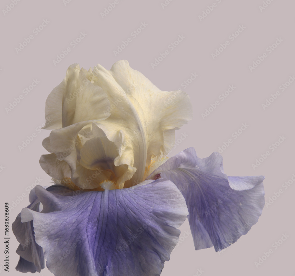 Smoke close-up lilac violet, cream beige Iris Flower petal.bud Macro blur natural art neutral gray background.