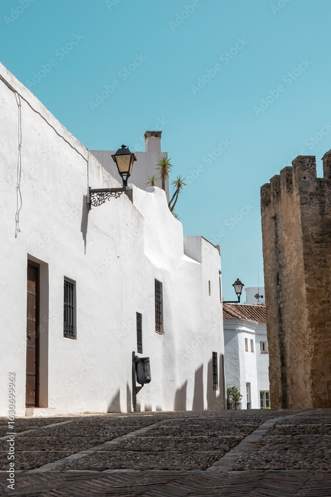 Intricate bronze knocker graces an aged wooden door, whispering tales of time through its ornate curves and timeless charm. In Vejer de la Frontera, Cadiz, Andalusia, Spain.